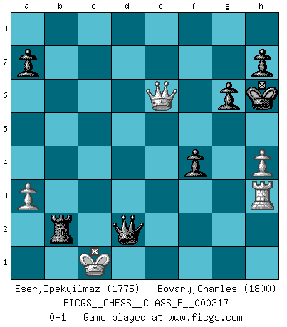 Last move : 0-1 2020 February 21 17:8:49 [Event "FICGS__CHESS__CLASS_B__000317"] [Site "FICGS"] [Date "2020.01.08"] [Round "1"] [White "Eser,Ipekyilmaz"] [Black "Bovary,Charles"] [Result "0-1"] [WhiteElo "1775"] [BlackElo "1800"] 1.a3 b5 2.d3 c5 3.e3 Bb7 4.e4 e6 5.g3 d5 6.Bg2 Nf6 7.f3 Bd6 8.Be3 Nbd7 9.Nd2 O-O 10.Ne2 Qc7 11.Bf2 dxe4 12.dxe4 Rad8 13.h3 Nb6 14.h4 Nh5 15.Nf1 f5 16.exf5 exf5 17.Qd3 Nc4 18.Rd1 Rfe8 19.Qb3 f4 20.Qxb5 Rxe2+ 21.Kxe2 Qe7+ 22.Kd3 Nxb2+ 23.Qxb2 Be5 24.Bd4 Bxd4 25.c3 Bxc3 26.Kxc3 Rxd1 27.Qb3+ Rd5 28.g4 Qe5+ 29.Kc2 Qe2+ 30.Kc1 Qxg2 31.Qxb7 Qxf3 32.Qb8+ Kf7 33.Qb7+ Kg6 34.gxh5+ Kxh5 35.Qf7+ Kh6 36.Qe6+ g6 37.Rh3 Qxf1+ 38.Kb2 Qf2+ 39.Kb3 c4+ 40.Kb4 Qd2+ 41.Kxc4 Qd4+ 42.Kb3 Rb5+ 43.Kc2 Rb2+ 44.Kc1 Qd2+ 0-1 Anderssen's Opening Kingside Castling by player Black (move 9) Player Black won this chess game. Follow this game move after move (download)At this time Fischer is simply a level above all the best Chessplayers in the world. (John Jacobs) Jeder Schachmeister war einmal ein Anfänger. (Irving Chernev) El poder defensivo de una pieza clavada, solamente es imaginario. (Aaron Nimzovich) Le système Elo représente seulement une moyenne. Il est simplement un indicateur de votre stabilité. (Anatoli Karpov) Secret operations are essential in war; upon them the army relies to make its every move. (Sun Tzu)
