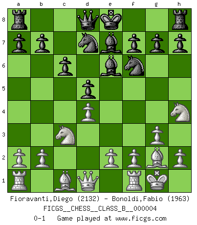 Last move : 0-1 2006 August 15 19:13:10 [Event "FICGS__CHESS__CLASS_B__000004"] [Site "FICGS"] [Date "2006.06.19"] [Round "1"] [White "Fioravanti,Diego"] [Black "Bonoldi,Fabio"] [Result "0-1"] [WhiteElo "2132"] [BlackElo "1963"] 1.g3 d5 2.Nf3 Nf6 3.d4 Bf5 4.Bg2 c6 5.c4 e6 6.O-O Be7 7.Nc3 Nbd7 8.cxd5 exd5 9.Nh4 Be6 0-1 Benko's Opening Kingside Castling by player White (move 6) Player Black won this chess game. Follow this game move after move (download)When you are lonely, when you feel yourself an alien in the world, play Chess. This will raise your spirits and be your counselor in war. (Aristotle) Wie bekannt hörte Morphy 1859 auf, Schach zu spielen. Seine Enttäuschung galt nicht so sehr dem Schach, wie den Schachspielern. (Robert James Fischer) La pasion por jugar al Ajedrez es una de las mas inexplicables en el mundo. (H.G. Wells) On peut tirer plus d'utilité d'une partie perdue que de 100 parties gagnées. (Capablanca) I have opinions of my own - strong opinions - but I don't always agree with them. (George Bush)