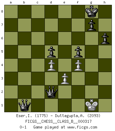 Last move : 0-1 2020 October 23 9:3:5 [Event "FICGS__CHESS__CLASS_B__000317"] [Site "FICGS"] [Date "2020.01.08"] [Round "1"] [White "Eser,Ipekyilmaz"] [Black "Duttagupta,Aniruddha"] [Result "0-1"] [WhiteElo "1775"] [BlackElo "2093"] 1.a3 e5 2.d3 d5 3.g3 Nf6 4.Bg2 c6 5.Bg5 Bc5 6.Bxf6 Qxf6 7.e3 O-O 8.h3 Be6 9.h4 Nd7 10.h5 h6 11.Qe2 Rae8 12.Nd2 e4 13.d4 Bd6 14.Nh3 c5 15.c3 cxd4 16.cxd4 Rc8 17.Kd1 Qd8 18.Nf4 Bxf4 19.gxf4 Qb6 20.Rb1 Nf6 21.Bh3 Bxh3 22.Rxh3 Rc6 23.f3 Rfc8 24.Ke1 Rc1+ 25.Kf2 R1c2 26.Rh2 exf3 27.Kxf3 Qe6 28.Rg1 Ne4 29.Qe1 Qf5 30.a4 Nxd2+ 31.Rxd2 Rxd2 32.Qxd2 Rc2 33.Qxc2 Qxc2 34.Rg2 Qd1+ 35.Kg3 Qxa4 36.Rf2 Qd1 37.Kg2 Qxh5 38.b3 Qg6+ 39.Kf3 Qe4+ 40.Ke2 Qc2+ 41.Kf1 Qxb3 42.Re2 a5 43.Kf2 a4 44.Kg1 a3 45.Re1 a2 46.Kf1 Qb1 47.Ke2 a1Q 48.Rxb1 Qxb1 49.Kd2 Qb2+ 50.Ke1 f5 51.Kf1 b5 52.Ke1 b4 53.Kf1 b3 54.Kg1 Qd2 55.Kh1 b2 56.Kg1 b1Q+ 0-1 Anderssen's Opening Kingside Castling by player Black (move 7) Promotion Queen by player Black (move 47) Promotion Queen by player Black (move 56) Player Black won this chess game. Follow this game move after move (download)Methodical thinking is of more use in Chess than inspiration. (C. J. S. Purdy) Die westlichen Werte sind eine Sprache, welche die Putin-Administration nicht versteht. (Garry Kasparov) El Ajedrez es como la guerra en un tablero. (Bobby Fischer) C'est la seule position que je connaisse où les deux camps sont mals. Propos prêtés à V. Anand. Now you put water in a cup, it becomes the cup; You put water into a bottle it becomes the bottle; You put it in a teapot it becomes the teapot. Water can flow or it can crash. Be water, my friend. (Bruce Lee)