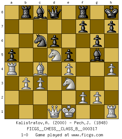 Last move : 1-0 2020 June 20 8:52:49 [Event "FICGS__CHESS__CLASS_B__000317"] [Site "FICGS"] [Date "2020.01.08"] [Round "1"] [White "Kalistratov,Aleksandr"] [Black "Pech,Jaroslav"] [Result "1-0"] [WhiteElo "2000"] [BlackElo "1848"] 1.e4 c5 2.Nf3 Nc6 3.d4 cxd4 4.Nxd4 Nf6 5.Nc3 e5 6.Ndb5 d6 7.Bg5 a6 8.Na3 b5 9.Nd5 Be7 10.Bxf6 Bxf6 11.c3 O-O 12.Nc2 Bg5 13.a4 bxa4 14.Rxa4 a5 15.Bc4 Rb8 16.b3 Kh8 17.Nce3 g6 18.h4 1-0 This chess game has been lost on time (started : 2020.01.08 14:15:7) Sicilian : Pelikan (Lasker/Sveshnikov) variation Kingside Castling by player Black (move 11) Player White won this chess game. Follow this game move after move (download)On the chessboard, lies and hypocrisy do not survive long. (Emanuel Lasker) Wer mein Gambit spielt, muß bereit sein, alle Brücken hinter sich abzubrechen. Es verändert den ganzen Menschen. Es wirkt wie ein Zauberstab und fördert verkümmerte, gute Charakter- eigenschaften wieder zu Tage. (Emil Joseph Diemer) Cualquier cambio de material en una posición debe venir por medio de un mate, una captura o promoción de Peón. (Purdy) À la honte des hommes, on sait que les lois du jeu sont les seules qui soient partout justes, claires, inviolables et exécutées. Pourquoi l'Indien qui a donné les règles du jeu d'échecs est-il obéi de bon gré dans toute la terre, et que les décrétales des papes, par exemple, sont aujourd'hui un objet d'horreur et de mépris ? C'est que l'inventeur des échecs combina tout avec justesse pour la satisfaction des joueurs, et que les papes, dans leurs décrétales, n'eurent en vue que leur seul avantage. L'Indien voulut exercer également l'esprit des hommes et leur donner du plaisir; les papes ont voulu abrutir l'esprit des hommes. Voltaire (Dictionnaire philosophique / Garnier 1967) If we don't succeed, we run the risk of failure. (George W. Bush)