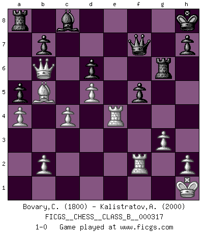 Last move : 1-0 2020 June 21 13:39:15 [Event "FICGS__CHESS__CLASS_B__000317"] [Site "FICGS"] [Date "2020.01.08"] [Round "1"] [White "Bovary,Charles"] [Black "Kalistratov,Aleksandr"] [Result "1-0"] [WhiteElo "1800"] [BlackElo "2000"] 1.e4 c5 2.Nf3 Nc6 3.d4 cxd4 4.Nxd4 Nf6 5.Nc3 e5 6.Ndb5 d6 7.Nd5 Nxd5 8.exd5 Nb8 9.a4 Be7 10.Be2 O-O 11.O-O Nd7 12.Bd2 a6 13.Na3 a5 14.f4 f5 15.Kh1 Bf6 16.Bb5 g5 17.fxg5 Bxg5 18.Nc4 Bxd2 19.Qxd2 Nf6 20.g3 Kh8 21.Rae1 Rg8 22.Qd3 Rg6 23.Ne3 Ng4 24.Nxg4 Rxg4 25.Qe3 Rg6 26.Rf2 Qg8 27.c4 Qf7 28.Qb6 e4 29.Rxe4 1-0 This chess game has been lost on time (started : 2020.01.08 14:15:7) Sicilian : Pelikan (Lasker/Sveshnikov) variation Kingside Castling by player Black (move 10) Kingside Castling by player White (move 11) Player White won this chess game. Follow this game move after move (download)It is difficult to play against Einstein's theory --on his first loss to Fischer. (Mikhail Tal) Die FIDE ist dabei in die Hände der russischen Mafia zu fallen. (Larry Evans) Por esta medida (el intervalo entre Fischer y sus contemporaneos), yo le considero el mas grande campeón mundial. (Garry Kasparov) Les Echecs, c'est l'art de la guerre sans les charniers, c'est la résurrection des morts tombés au champ d'honneur, l'espoir perpétuel, la suprématie de l'intelligence sur la force, la culture de l'esprit. (F. Szpiner) You can only get smarter by playing a smarter opponent. (Revolver, movie)
