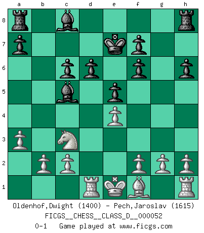 Last move : 0-1 2007 December 2 8:4:26 [Event "FICGS__CHESS__CLASS_D__000052"] [Site "FICGS"] [Date "2007.07.04"] [Round "1"] [White "Oldenhof,Dwight"] [Black "Pech,Jaroslav"] [Result "0-1"] [WhiteElo "1400"] [BlackElo "1615"] 1.e4 c5 2.Nf3 Nc6 3.d4 cxd4 4.Nxd4 Nf6 5.Nc3 e5 6.Nxc6 bxc6 7.a3 Bc5 8.Qf3 d6 9.Bg5 h6 10.Bxf6 Qxf6 11.Qxf6 gxf6 12.Rd1 Ke7 0-1 This chess game has been lost on time (started : 2007.07.04 10:44:39) Sicilian : Pelikan (Lasker/Sveshnikov) variation Player Black won this chess game. Follow this game move after move (download)You can only get good at Chess if you love the game. (Bobby Fischer) Ich verachte die Medien. (Robert James Fischer) Existen dos clases de sacrificios: los correctos y los míos. (Mikhail Tal) Vous savez, camarade Pachman, je n'éprouve pas de plaisir à être ministre, je jouerais plutôt aux échecs comme vous, ou alors ferais une révolution au Venezuela. (Che Guevara à Ludek Pachman, 'Checkmate in Prague', 1975) Internet: Absolute communication, absolute isolation. (Paul Carvel)