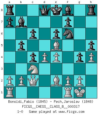 Last move : 1-0 2020 May 26 3:0:26 [Event "FICGS__CHESS__CLASS_B__000317"] [Site "FICGS"] [Date "2020.01.08"] [Round "1"] [White "Bonoldi,Fabio"] [Black "Pech,Jaroslav"] [Result "1-0"] [WhiteElo "1845"] [BlackElo "1848"] 1.d4 d5 2.c4 e6 3.Nc3 Nf6 4.Nf3 c6 5.Bg5 h6 6.Bh4 dxc4 7.e4 g5 8.Bg3 b5 9.Be2 Bb7 10.h4 g4 11.Ne5 h5 12.O-O Nbd7 13.Qc2 Nxe5 14.Bxe5 1-0 This chess game has been lost on time (started : 2020.01.08 14:15:7) QGD Semi-Slav Kingside Castling by player White (move 12) Player White won this chess game. Follow this game move after move (download)Bobby just drops the pieces and they fall on the right squares. (Miguel Najdorf) Früher wurde jeder komplizierte Zug, jedes interessante Opfer mit großem Beifall und Enthusiasmus aufgenommen. Heute schaltet man einfach seinen Fritz an, und man kann sehen, was los ist, ob der Zug geht oder nicht. (Vladimir Kramnik) Aunque la mayoría de la gente disfruta observar las partidas de los grandes Maestros de ataque, algunos de los jugadores mas notables en la historia han sido los jugadores silenciosos posicionales. Lentamente ellos te aplastan despojandote de tu espacio, congestionando tus piezas y dejandote virtualmente sin nada que hacer. (Yasser Seirawan) Mais n'est-ce pas déjà le limiter injurieusement que d'appeler les échecs un jeu? N'est-ce pas aussi une science, un art, ou quelque chose qui, comme le cercueil de Mahomet entre ciel et terre, est suspendu entre l'un et l'autre, et qui réunit un nombre incroyable de contraires ? (Stefan Zweig) After growing wildly for years, the field of computing appears to be reaching its infancy. (John Pierce)