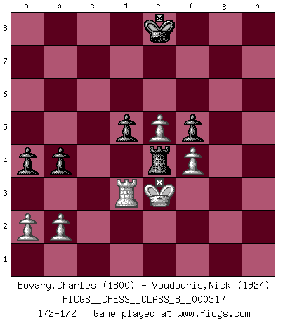Last move : 1/2-1/2 2020 March 4 19:11:32 [Event "FICGS__CHESS__CLASS_B__000317"] [Site "FICGS"] [Date "2020.01.08"] [Round "1"] [White "Bovary,Charles"] [Black "Voudouris,Nick"] [Result "1/2-1/2"] [WhiteElo "1800"] [BlackElo "1924"] 1.d4 d5 2.c4 e6 3.Nf3 c6 4.Nc3 f5 5.Bf4 Bd6 6.Qd2 Nf6 7.Ne5 O-O 8.e3 Ne4 9.Nxe4 fxe4 10.O-O-O a5 11.f3 Bxe5 12.Bxe5 Nd7 13.Bd6 Rf7 14.Bg3 exf3 15.gxf3 b5 16.cxb5 cxb5 17.Kb1 Nb6 18.Qc2 Nc4 19.Bd3 Kh8 20.Bxh7 Nxe3 21.Qg6 Qf6 22.Rd3 Qf5 23.Be5 Nc4 24.Qxf5 exf5 25.Bg6 Re7 26.f4 Ra6 27.Rg3 Kg8 28.h4 a4 29.h5 Kf8 30.h6 gxh6 31.Rxh6 Nxe5 32.dxe5 Rg7 33.Rh8+ Ke7 34.Rxc8 R7xg6 35.R8c3 b4 36.Rc7+ Ke8 37.Rd3 Rg1+ 38.Rc1 Rxc1+ 39.Kxc1 Rc6+ 40.Kd2 Rc4 41.Ke3 Re4+ 1/2-1/2 Queen's gambit declined Kingside Castling by player Black (move 7) Queenside Castling by player White (move 10) This chess game ended in a draw. Follow this game move after move (download)You can only get good at Chess if you love the game. (Bobby Fischer) Computer sind die einzigen Gegner, die nicht immer eine Ausrede auf Lager haben, wenn sie gegen mich verlieren. (Robert James Fischer) Si el ingenio solamente fuese necesario para lucirse, las mujeres serían las mejores jugadoras de Ajedrez del mundo. (Albin) Même si vous avez un bon coup à faire, regardez toujours s'il n'y en a pas un qui lui soit préférable. (Pedro Damiano) Success without honor is an unseasoned dish; it will satisfy your hunger, but it won't taste good. (Joe Paterno)