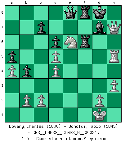 Last move : 1-0 2020 March 9 9:29:21 [Event "FICGS__CHESS__CLASS_B__000317"] [Site "FICGS"] [Date "2020.01.08"] [Round "1"] [White "Bovary,Charles"] [Black "Bonoldi,Fabio"] [Result "1-0"] [WhiteElo "1800"] [BlackElo "1845"] 1.f4 g6 2.e4 Bg7 3.d4 d6 4.Nf3 a6 5.Nc3 b5 6.a4 b4 7.Nd5 a5 8.Ne3 Bb7 9.Bc4 e6 10.O-O Nd7 11.Ng5 Nh6 12.Bxe6 fxe6 13.Nxe6 Qe7 14.Nd5 Bxd5 15.exd5 Nf6 16.Qd3 Kf7 17.f5 Nxf5 18.Bg5 h5 19.Rxf5 gxf5 20.Rf1 Rhf8 21.Rxf5 Kg8 22.Bh4 Rf7 23.Rxh5 Raf8 24.h3 Qe8 25.Bxf6 Rxf6 26.Qh7+ 1-0 Bird's Opening Kingside Castling by player White (move 10) Player White won this chess game. Follow this game move after move (download)Fischer is under obligation to nobody. (Joseph Platz) Fischer machte Schach einfach zu einer aufregenden Sache, wann immer er sich ans Brett setzte. (Raymond Keene) Una de estas pequeñas movidas modestas pudieran ser mas molestas a tu oponente que la amenaza mas grande. (Siegbert Tarrasch) RxDa4 pat (...) Wisdom begins at the end. (Daniel Webster)