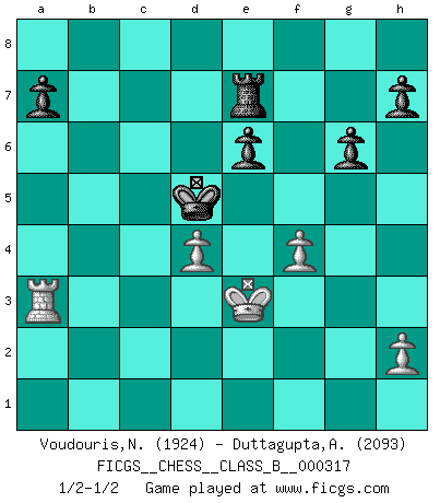 Last move : 1/2-1/2 2020 November 26 18:51:17 [Event "FICGS__CHESS__CLASS_B__000317"] [Site "FICGS"] [Date "2020.01.08"] [Round "1"] [White "Voudouris,Nick"] [Black "Duttagupta,Aniruddha"] [Result "1/2-1/2"] [WhiteElo "1924"] [BlackElo "2093"] 1.d4 Nf6 2.f4 d5 3.e3 Bf5 4.Bd3 e6 5.Nf3 Bxd3 6.Qxd3 c5 7.O-O Nc6 8.b3 cxd4 9.exd4 Rc8 10.c4 dxc4 11.bxc4 b5 12.Na3 bxc4 13.Nxc4 Be7 14.Bd2 Bc5 15.Be3 O-O 16.Rfd1 Be7 17.a3 Nd5 18.Rdc1 Qd7 19.Bd2 f6 20.g3 Rfe8 21.Re1 Bf8 22.Rab1 Red8 23.Na5 Nb6 24.Re4 g6 25.Nxc6 Rxc6 26.Re2 Rdc8 27.Kf2 Nc4 28.a4 Nxd2 29.Rxd2 Rc4 30.Re2 Qc6 31.Qe3 Kf7 32.a5 Rc7 33.Rb8 Qd5 34.Qb3 Qxa5 35.g4 Qa4 36.g5 Qxb3 37.Rxb3 Bd6 38.gxf6 Kxf6 39.Ng5 Rc2 40.Ne4+ Ke7 41.Nxd6 Kxd6 42.Ra3 Rxe2+ 43.Kxe2 Rf7 44.Ra6+ Kd5 45.Ke3 Rb7 46.Ra3 Re7 1/2-1/2 Follow this game move after move (download)Excellence at Chess is one mark of a scheming mind. (Sir Arthur Conan Doyle) Frage des Reporters: -Worin besteht das Ziel von Gambiteröffnungen? Antwort: -Auf Kosten der Partie einen Ruf als Angriffspieler zu erwerben.- (Siegbert Tarrasch) Hay jugadores fuertes y personas amables y yo soy un jugador fuerte. (Bobby Fischer) La guerre est enfant de la passion, la passion est enfant du narcissisme et le narcissisme est l'enfant. (...) Une autre partie ? (Thibault de Vassal) It's unlucky to be superstitious. (Dave Enteles)