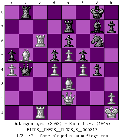 Last move : 1/2-1/2 2020 June 13 19:18:45 [Event "FICGS__CHESS__CLASS_B__000317"] [Site "FICGS"] [Date "2020.01.08"] [Round "1"] [White "Duttagupta,Aniruddha"] [Black "Bonoldi,Fabio"] [Result "1/2-1/2"] [WhiteElo "2093"] [BlackElo "1845"] 1.e4 g6 2.d4 Bg7 3.Nc3 d6 4.Be3 a6 5.f4 b5 6.Bd3 Bb7 7.Nf3 Nd7 8.e5 e6 9.a4 b4 10.Ne4 Bxe4 11.Bxe4 d5 12.Bd3 a5 13.O-O Ne7 14.Rc1 O-O 15.c3 bxc3 16.Rxc3 Rb8 17.b3 c6 18.Qe2 Qb6 19.Kh1 Rfe8 20.g4 f5 21.Ng5 Nf8 22.Nf3 fxg4 23.Nh4 Nf5 24.Nxf5 gxf5 25.Rfc1 Re7 26.Rxc6 Qxb3 27.Bb5 Ng6 28.R6c3 Qb4 29.Rc6 1/2-1/2 Robatsch (Modern) defense Kingside Castling by player White (move 13) Kingside Castling by player Black (move 14) This chess game ended in a draw. Follow this game move after move (download)Suddenly it was obvious to me in my analysis I had missed what Fischer had found with the greatest of ease at the board. (Mikhail Botvinnik) Der Knackpunkt bei der Konzentration ist, daß wir nur durch sie etwas Neues und Ungewöhnliches am Schachbrett finden können. Sie ist der einzige Weg durch neue neue Ideen eine Überraschung zu bereiten. (Garry Kasparov) El Ajedrez te enseña a controlarl la excitación inicial que sientes cuando vez algo que parece bueno y te enseña a pensar objetivamente cuando te encuentras en problemas. (Stanley Kubrick) Le profane ne songe pas à la somme de jouissance dont il se prive, qui méconnaît ce jeu aux ressources aussi variées que passionnantes. (Jean-Marie Jeanton-Lamarche) Never risk one's whole fortune unless supported by one's entire army. (Niccolo Machiavelli)