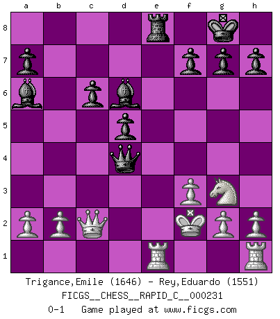 Last move : 0-1 2020 February 24 7:51:13 [Event "FICGS__CHESS__RAPID_C__000231"] [Site "FICGS"] [Date "2020.01.12"] [Round "1"] [White "Trigance,Emile"] [Black "Rey,Eduardo"] [Result "0-1"] [WhiteElo "1646"] [BlackElo "1551"] 1.d4 Nf6 2.Bg5 Ne4 3.Bf4 c5 4.f3 Qa5+ 5.c3 Nf6 6.Bd2 d5 7.c4 Qc7 8.cxd5 e6 9.e3 Nxd5 10.Nc3 cxd4 11.Nxd5 exd5 12.exd4 Bd6 13.Bb5+ Nc6 14.Bxc6+ bxc6 15.Qc2 O-O 16.Ne2 Ba6 17.Kf2 Rae8 18.Rae1 Qe7 19.Ng3 Qh4 20.Be3 Rxe3 21.Kxe3 Re8+ 22.Kf2 Qxd4+ 0-1 Trompowsky attack (Ruth, Opovcensky Opening) Kingside Castling by player Black (move 15) Player Black won this chess game. Follow this game move after move (download)Nowadays, when you're not a grandmaster at 14, you can forget about it. (Anand Viswanathan) Ich erzeugte keinen Neid, da mich die Schachspieler als Musiker und die Musiker als Schachspieler betrachteten. (Mark Taimanov) Cualquier cambio de material en una posición debe venir por medio de un mate, una captura o promoción de Peón. (Purdy) Les Echecs ont trois composantes : le temps, l'espace et le matériel en dernier. (Mikhail Tal) Have no fear of perfection - you'll never reach it. (Salvador Dali)