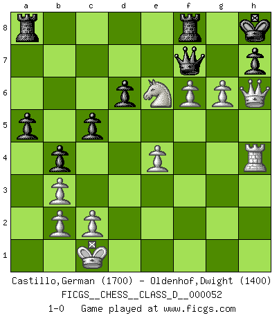 Last move : 1-0 2007 November 21 7:29:30 [Event "FICGS__CHESS__CLASS_D__000052"] [Site "FICGS"] [Date "2007.07.04"] [Round "1"] [White "Castillo,German"] [Black "Oldenhof,Dwight"] [Result "1-0"] [WhiteElo "1700"] [BlackElo "1400"] 1.d4 Nf6 2.Nc3 d6 3.e4 g6 4.Be3 c6 5.Qd2 Nbd7 6.f3 Bg7 7.g4 O-O 8.h4 b5 9.h5 b4 10.Nce2 a5 11.Bh6 Bxh6 12.Qxh6 e5 13.hxg6 fxg6 14.g5 Nh5 15.Ng3 Qe7 16.Nxh5 gxh5 17.Rxh5 Kh8 18.O-O-O exd4 19.Rxd4 Ne5 20.Be2 Rd8 21.f4 Ng4 22.Qg6 c5 23.Rd2 Rf8 24.f5 Ne3 25.f6 Qc7 26.Qh6 Bg4 27.Rh4 Bxe2 28.Nxe2 Nc4 29.Nf4 Nxd2 30.Ne6 Nb3+ 31.axb3 Qf7 32.g6 1-0 Queen's pawn game Kingside Castling by player Black (move 7) Queenside Castling by player White (move 18) Player White won this chess game. Follow this game move after move (download)He who takes the Queen's Knight's Pawn will sleep in the streets. (Anonymous) Du weisst es gibt ein Problem mit Computern und Fernschach, wenn jeder eine Rating von 2450 hat. (John Christen Knudsen) Bobby solo arroja las piezas y solas caen en las casillas correctas. (Miguel Najdorf ) Mais l'homme est une créature légère et illogique : semblable au joueur d'échecs, il n'aime que le processus du but à atteindre, non le but lui-même. (Dostoïevsky) Luck is the residue of design. (John Milton)