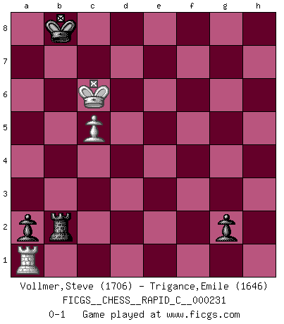 Last move : 0-1 2020 March 8 11:23:22 [Event "FICGS__CHESS__RAPID_C__000231"] [Site "FICGS"] [Date "2020.01.12"] [Round "1"] [White "Vollmer,Steve"] [Black "Trigance,Emile"] [Result "0-1"] [WhiteElo "1706"] [BlackElo "1646"] 1.d4 Nf6 2.c4 e6 3.Nf3 b6 4.g3 Bb7 5.Bg2 Be7 6.O-O O-O 7.Nc3 Ne4 8.Qc2 Nxc3 9.Qxc3 c5 10.dxc5 bxc5 11.Be3 Qc7 12.Rac1 Nc6 13.b3 d6 14.Rfd1 Bf6 15.Qd2 Rfd8 16.a3 a5 17.Bg5 Qe7 18.Bxf6 Qxf6 19.Qc3 Qe7 20.Qe3 h6 21.h4 Qf6 22.Nd2 Qe7 23.f4 Nd4 24.Bxb7 Qxb7 25.Kf2 Nf5 26.Qf3 Qxf3+ 27.Nxf3 Rab8 28.Rd3 Rb6 29.Rcd1 Rdb8 30.g4 Ne7 31.Rxd6 Rxd6 32.Rxd6 Rxb3 33.Rd3 a4 34.Ne5 Rb8 35.Rd7 Ng6 36.Nxg6 fxg6 37.Rd3 Kf8 38.Kf3 Ke7 39.Ke4 Rb6 40.Ke5 Rb2 41.Re3 Rc2 42.Re4 Rc3 43.f5 gxf5 44.gxf5 exf5 45.Kxf5 Kf7 46.Ke5 Rxa3 47.Kd5 Rb3 48.Kxc5 a3 49.Rd4 Rb2 50.Rd1 a2 51.Ra1 Rxe2 52.Kc6 Ke7 53.c5 Kd8 54.Kd6 Rd2+ 55.Kc6 g5 56.hxg5 hxg5 57.Kb7 Rb2+ 58.Kc6 g4 59.Kd6 Rd2+ 60.Kc6 g3 61.Kb7 Rb2+ 62.Kc6 g2 63.Kd6 Kc8 64.Kc6 Kb8 0-1 Queen's Indian : Old Main line, 7.Nc3 Kingside Castling by player White (move 6) Kingside Castling by player Black (move 6) 10 pieces endgame at move 48 : White KRPPP , Black KRPPP WHITE : King + 1 Rook 3 Pawns BLACK : King + 1 Rook 3 Pawns 9 pieces endgame at move 51 : White KRPP , Black KRPPP WHITE : King + 1 Rook 2 Pawns BLACK : King + 1 Rook 3 Pawns 8 pieces endgame at move 56 : White KRPP , Black KRPP WHITE : King + 1 Rook 2 Pawns BLACK : King + 1 Rook 2 Pawns 7 pieces endgame at move 56 : White KRP , Black KRPP WHITE : King + 1 Rook 1 Pawn BLACK : King + 1 Rook 2 Pawns Player Black won this chess game. Follow this game move after move (download)We cannot resist the fascination of sacrifice, since a passion for sacrifices is part of a Chessplayer's nature. (Rudolf Spielman) Viele Opfer benötigen überhaupt keine konkrete Berechnung. Es genügt sich die entstehende Position kurz vorzustellen, um uns davon zu überzeugen, dass das Opfer korrekt ist. (Mikhail Nekhemyevich Tal) Juega la Apertura como un libro, el Juego Medio como un mago y los Finales como una máquina. (Spielmann) Toute estimation doit être constamment réévaluée. (Jacob Estrin) The modern world has divided itself into Conservatives and Progressives. The business of Progressives is to go on making mistakes. The business of the Conservatives is to prevent the mistakes from being corrected. (G.K. Chesterton)