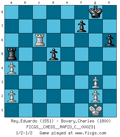 Last move : 1/2-1/2 2020 March 3 15:2:34 [Event "FICGS__CHESS__RAPID_C__000231"] [Site "FICGS"] [Date "2020.01.12"] [Round "1"] [White "Rey,Eduardo"] [Black "Bovary,Charles"] [Result "1/2-1/2"] [WhiteElo "1551"] [BlackElo "1800"] 1.e4 e5 2.Nf3 Nc6 3.d4 exd4 4.Nxd4 Nf6 5.Nc3 Bb4 6.Nxc6 bxc6 7.Bd3 d5 8.exd5 cxd5 9.O-O O-O 10.Bg5 c6 11.Ne2 h6 12.Bh4 Bd6 13.Nd4 c5 14.Nf5 Bxf5 15.Bxf5 g6 16.Bh3 g5 17.Bg3 Bxg3 18.hxg3 Rb8 19.b3 Re8 20.Bf5 Re5 21.Bd3 Qa5 22.f4 gxf4 23.Qc1 c4 24.Qxf4 Qb6+ 25.Rf2 cxd3 26.Qxf6 Qxf6 27.Rxf6 dxc2 28.Rc6 Re2 29.Rc1 a5 30.R1xc2 Rxc2 31.Rxc2 Rb5 32.Rc6 a4 33.bxa4 Ra5 1/2-1/2 Scotch : Schmidt variation Kingside Castling by player White (move 9) Kingside Castling by player Black (move 9) This chess game ended in a draw. Follow this game move after move (download)Bobby Fischer is the greatest Chess genius of all time ! (Alexander Kotov) Karpov ist ein Museumsstück. (Garry Kasparov) Tu cuerpo tiene que estar en óptima condición. Tu Ajedrez se deteriora como lo hace tu cuerpo. No puedes separar la mente y el cuerpo. (Bobby Fischer) Ce n'est pas pour s'amuser qu'il joue aux échecs : il célèbre un culte. (Vladimir Nabokov) If you are good, you will be assigned all the work. If you are really good, you will get out of it. (Dan Rotaru)