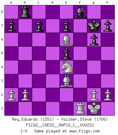 Last move : 1-0 2020 February 23 16:49:54 [Event "FICGS__CHESS__RAPID_C__000231"] [Site "FICGS"] [Date "2020.01.12"] [Round "1"] [White "Rey,Eduardo"] [Black "Vollmer,Steve"] [Result "1-0"] [WhiteElo "1551"] [BlackElo "1706"] 1.e4 Nf6 2.e5 Nd5 3.d4 d6 4.c4 Nb6 5.f4 g6 6.Nc3 Bg7 7.Be3 Nc6 8.Nf3 dxe5 9.fxe5 Bf5 10.Be2 Qd7 11.O-O O-O 12.Qd2 f6 13.e6 Qd8 14.d5 Ne5 15.Nxe5 fxe5 16.c5 Nxd5 17.Qxd5 Qc8 18.c6 bxc6 19.Qxc6 Bxe6 20.Rxf8+ Bxf8 21.Ba6 Bd7 22.Qd5+ Be6 23.Qe4 Bf5 24.Bxc8 Bxe4 25.Be6+ Kg7 26.Nxe4 Rb8 27.Rf1 1-0 Alekhine's defense : Four pawns attack, Fianchetto variation Kingside Castling by player White (move 11) Kingside Castling by player Black (move 11) Player White won this chess game. Follow this game move after move (download)There are two types of sacrifices: correct ones and mine. (Mikhail Tal) Wie gewinnt Tal? Er entwickelt alle seine Figuren in die Brettmitte und opfert sie dann irgendwo. (Robert James Fischer) Tu sabes, camarada Pachman, no disfruto el ser un Ministro, preferería jugar al Ajedrez como tu. (Che Guevara) Avec des compensations pour le matériel en plus... (Anonyme) A bird doesn't sing because it has an answer, it sings because it has a song. (Maya Angelou)