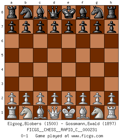 Last move : 0-1 2020 February 11 15:15:38 [Event "FICGS__CHESS__RAPID_C__000231"] [Site "FICGS"] [Date "2020.01.12"] [Round "1"] [White "Elgoog,Blobers"] [Black "Gossmann,Ewald"] [Result "0-1"] [WhiteElo "1500"] [BlackElo "1897"] 0-1 This chess game has been lost on time (started : 2020.01.12 11:17:44) Player Black won this chess game. Follow this game move after move (download)Chess is mental torture. (Garry Kasparov) Mein Name ist Rustam Kamsky. Sie haben meinen Sohn belästigt. Bereiten Sie sich aufs Sterben vor. (Rustam Kamsky) El Ajedrez hace al hombre ser mas sabio y ver mas claro. (Vladimir Putin) Aux échecs, les retours au sommet sont rares : les dommages psychologiques consécutifs à une défaite sont trop sévères. (Daily Telegraph) As the days dwindle down... to a precious few. (Maxwell Anderson)