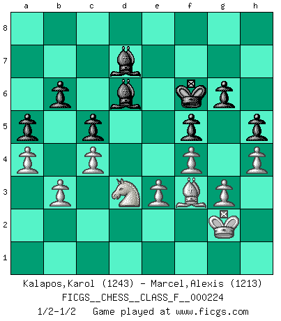 Last move : 1/2-1/2 2020 March 2 20:2:46 [Event "FICGS__CHESS__CLASS_F__000224"] [Site "FICGS"] [Date "2020.01.13"] [Round "1"] [White "Kalapos,Karol"] [Black "Marcel,Alexis"] [Result "1/2-1/2"] [WhiteElo "1243"] [BlackElo "1213"] 1.d4 f5 2.c4 Nf6 3.g3 g6 4.Bg2 Bg7 5.Nf3 O-O 6.Nc3 d6 7.Bg5 Re8 8.O-O Nbd7 9.Qc2 e5 10.dxe5 Nxe5 11.Rad1 Qd7 12.b3 Nxf3+ 13.Bxf3 c6 14.e3 Qc7 15.Bg2 Bd7 16.Ne2 a6 17.Nf4 Rad8 18.a4 Kf7 19.Qd3 h6 20.Bxf6 Bxf6 21.Qxd6 Qxd6 22.Rxd6 Bc8 23.Rfd1 Rxd6 24.Rxd6 Rd8 25.Rxd8 Bxd8 26.Nd3 Bc7 27.Kf1 Bd6 28.Ke2 Be6 29.f4 Ke7 30.h4 Bd7 31.Kd2 b6 32.Kc3 c5 33.Bb7 a5 34.Bf3 Kf6 35.Kd2 h5 36.Ke2 Be6 37.Kf2 Bd7 38.Kg2 1/2-1/2 Dutch : Leningrad, Main variation Kingside Castling by player Black (move 5) Kingside Castling by player White (move 8) This chess game ended in a draw. Follow this game move after move (download)Up to this point White has been following well-known analysis. But now he makes a fatal error: he begins to use his own head. (Siegbert Tarrasch) Wir irren allesamt, nur jeder irrt anders. (Georg Christoph Lichtenberg) Después de la respuesta de las negras a 1.e4 con 1..e5, se quedan siempre tratando de entrar dentro del juego. (Howard Staunton) Comme les marins qui ont mille raisons différentes d'aller en mer, les joueurs d'échecs en ont tout autant avant de s'installer devant une table et jouer... (Vincent Bertignac, philosophe) He is a liar. I just don't know what the lie is yet. (Horatio Caine, C.S.I. Miami)