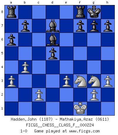 Last move : 1-0 2020 July 13 7:11:32 [Event "FICGS__CHESS__CLASS_F__000224"] [Site "FICGS"] [Date "2020.01.13"] [Round "1"] [White "Hadden,John"] [Black "Mathakiya,Azaz"] [Result "1-0"] [WhiteElo "1187"] [BlackElo "0611"] 1.d4 Nf6 2.Nf3 d5 3.Nc3 e6 4.Bg5 Be7 5.e3 O-O 6.Qd2 Nbd7 7.Bxf6 Nxf6 8.h3 a6 9.a3 c5 10.dxc5 Bxc5 11.b4 Bd6 12.Bd3 Bd7 13.Ne2 e5 14.Nfg1 e4 15.Bxe4 Nxe4 16.Qd3 Qf6 17.Nf3 Qxa1+ 18.Qd1 Qxd1+ 19.Kxd1 Nxf2+ 20.Ke1 Nxh1 21.Kf1 Ng3+ 22.Nxg3 1-0 This chess game has been lost on time (started : 2020.01.13 12:54:49) Queen's pawn game Kingside Castling by player Black (move 5) Player White won this chess game. Follow this game move after move (download)When I asked Fischer why he had not played a certain move in our game, he replied: 'Well, you laughed when I wrote it down !' (Mikhail Tal) Lisa Lane, amerikanische Schachmeisterin, hatte Fischer einmal als stärksten lebenden Spieler bezeichnet. Antwort: Das ist richtig, aber Lisa Lane ist eigentlich nicht in der Lage, das zu beurteilen. (Robert James Fischer) De todos mis libros Rusos, la defensa contiene y difunde el 'calor' mas grande que pudiese verse extraño al observar lo supremamente abstracto que el Ajedrez supuestamente es. (Vladimir Nabokov) Aucun coup ne doit être joué sans but. (Pedro Damiano) Beta. Software undergoes beta testing shortly before it's released. Beta is latin for still doesn't work. (Anonymous)
