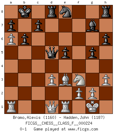 Last move : 0-1 2020 June 20 12:59:48 [Event "FICGS__CHESS__CLASS_F__000224"] [Site "FICGS"] [Date "2020.01.13"] [Round "1"] [White "Bromo,Alexis"] [Black "Hadden,John"] [Result "0-1"] [WhiteElo "1160"] [BlackElo "1187"] 1.e4 e5 2.Nf3 Nc6 3.Nc3 h6 4.Bc4 d6 5.O-O Nf6 6.d3 Be6 7.Bxe6 fxe6 8.Re1 Qd7 9.h3 O-O-O 10.a3 g5 11.b4 Kb8 12.b5 Nd4 13.a4 Bg7 14.a5 Nxb5 15.Nxb5 Qxb5 16.Bd2 Ne8 17.c4 Qd7 18.Be3 d5 19.cxd5 exd5 20.exd5 Qxd5 21.a6 b6 0-1 Three knights game Kingside Castling by player White (move 5) Queenside Castling by player Black (move 9) Player Black won this chess game. Follow this game move after move (download)Help your pieces so they can help you. (Paul Morphy) Kritik überlasse ich den Spießern. Ich zeige nichts, wofür ich mich schämen muss. (Alexandra Kosteniuk) El Peón aislado arroja penumbra sobre todo el tablero. (Aaron Nimzovich) Aux échecs, les retours au sommet sont rares : les dommages psychologiques consécutifs à une défaite sont trop sévères. (Daily Telegraph) Memory is a way of holding onto the things you love, the things you are, the things you never want to lose. (from the television show: The Wonder Years)