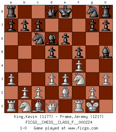 Last move : 1-0 2020 February 24 12:54:36 [Event "FICGS__CHESS__CLASS_F__000224"] [Site "FICGS"] [Date "2020.01.13"] [Round "1"] [White "King,Kevin"] [Black "Frame,Jeremy"] [Result "1-0"] [WhiteElo "1177"] [BlackElo "1217"] 1.f4 d5 2.Nf3 Nc6 3.e3 Bg4 4.Be2 f5 5.d3 e6 6.O-O Bd6 7.h3 Bh5 8.a3 1-0 This chess game has been lost on time (started : 2020.01.13 12:54:49) Bird's Opening Kingside Castling by player White (move 6) Player White won this chess game. Follow this game move after move (download)War is the child of passion, passion is the child of narcissism and narcissism is the child. (...) Another game ? (Thibault de Vassal) Ich bin der einzige Schachspieler, der sich während der Vorbereitungen zum Turnier verletzt hat. (Woody Allen) No hay un Gran Maestro de Ajedrez que sea normal; solo se diferencían ellos por la magnitud de su locura. (Viktor Korchnoi) Toutes les manuvres exécutées sur une colonne ouverte ont pour but ultime l'intrusion définitive sur la septième ou la huitième rangée, en plein cur de la position ennemie. (Aaron Nimzovitch) Life is like internet, nothing interesting, but noone want to leave it. (Ilmars Cirulis)