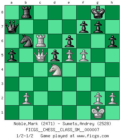 Last move : 1/2-1/2 2007 September 21 9:15:28 [Event "FICGS__CHESS__CLASS_SM__000007"] [Site "FICGS"] [Date "2007.07.05"] [Round "1"] [White "Noble,Mark"] [Black "Sumets,Andrey"] [Result "1/2-1/2"] [WhiteElo "2471"] [BlackElo "2528"] 1.e4 e6 2.d4 d5 3.Nc3 Nf6 4.e5 Nfd7 5.f4 c5 6.Nf3 Nc6 7.Be3 a6 8.Be2 b5 9.O-O Qb6 10.a4 Nxd4 11.Nxd4 cxd4 12.Bxd4 Bc5 13.Bxc5 Qxc5+ 14.Rf2 b4 15.Na2 O-O 16.Nc1 a5 17.Nb3 Qc7 18.c3 bxc3 19.Rc1 Ba6 20.Bxa6 Rxa6 21.Rxc3 Qb6 22.Nd4 Nc5 23.Rfc2 Nxa4 24.Rc6 Qb7 25.Rxa6 Qxa6 26.Rc6 Nb6 27.Qb3 Rb8 28.f5 Qa7 29.Qc3 h6 30.Qc5 1/2-1/2 French : Steinitz, Boleslavsky variation Kingside Castling by player White (move 9) Kingside Castling by player Black (move 15) This chess game ended in a draw. Follow this game move after move (download)By the beauty of his games, the clarity of his play, and the brilliance of his ideas, Fischer made himself an artist of the same stature as Brahms, Rembrandt, and Shakespeare. (David Levy) Der vorletzte Fehler gewinnt. (Savielly Grigorievitsch Tartakower) No soy una persona materialista y por eso, no resiento la falta o pérdida del dinero. La ausencia de cosas mundanas carece de importancia. Ya que el Ajedrez es una forma en la que puedo ser tan materialista como yo desee sin tener la necesidad de vender mi alma. (Jamie Walter Adams) A ce moment-là, je menaçais de comprendre la position ! (Clément L'Heureux) Whoever said the pen is mightier than the sword obviously never encountered automatic weapons. (US General Douglas MacArthur)