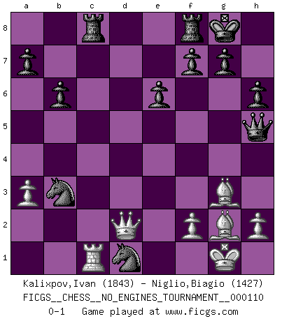 Last move : 0-1 2020 March 10 23:32:5 [Event "FICGS__CHESS__NO_ENGINES_TOURNAMENT__000110"] [Site "FICGS"] [Date "2020.01.13"] [Round "1"] [White "Kalixpov,Ivan"] [Black "Niglio,Biagio"] [Result "0-1"] [WhiteElo "1843"] [BlackElo "1427"] 1.e4 c6 2.d4 d5 3.exd5 cxd5 4.c4 Nf6 5.Nc3 e6 6.Nf3 Bb4 7.Bd3 dxc4 8.Bxc4 O-O 9.O-O b6 10.a3 Bxc3 11.bxc3 Bb7 12.Bg5 Nbd7 13.Re1 Rc8 14.Qb3 Qc7 15.Bd3 Qxc3 16.Qb1 Bxf3 17.gxf3 h6 18.Bh4 Qxd4 19.Bg3 Qd5 20.Rd1 Qxf3 21.Bf1 Nd5 22.Bg2 Qh5 23.Qb5 Nc5 24.Rac1 Nc3 25.Qb2 Nxd1 26.Qd2 Nb3 0-1 Caro-Kann : Panov-Botvinnik attack, 5...e6 Kingside Castling by player Black (move 8) Kingside Castling by player White (move 9) Player Black won this chess game. Follow this game move after move (download)On the chessboard, lies and hypocrisy do not survive long. (Emanuel Lasker) Mein Name ist Rustam Kamsky. Sie haben meinen Sohn belästigt. Bereiten Sie sich aufs Sterben vor. (Rustam Kamsky) La batalla por la última verdad nunca sera ganada. Y es por eso que el Ajedrez es tan fascinante. (Hans Kmoch) Je crois qu'il existe des manières très spécifiques de jouer efficacement contre une machine. Evidemment, nous n'avons aucune chance en technique pure, parce que l'ordinateur calcule de manière parfaite. Mais lorsque nous faisons appel à notre cerveau, en utilisant l'intuition et la compréhension, alors nous restons beaucoup plus forts. (Anatoli Karpov) History is the quarrels of popes and kings, with wars or pestilences in every page; the men all so good for nothing, and hardly any women at all. (Jane Austen)