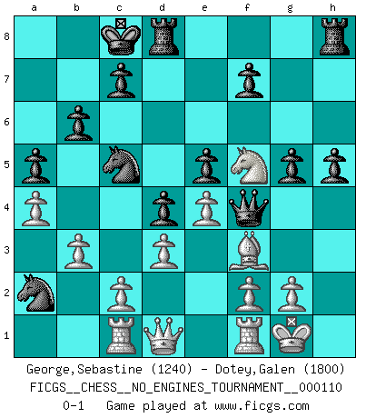 Last move : 0-1 2020 April 22 20:37:43 [Event "FICGS__CHESS__NO_ENGINES_TOURNAMENT__000110"] [Site "FICGS"] [Date "2020.01.13"] [Round "1"] [White "George,Sebastine"] [Black "Dotey,Galen"] [Result "0-1"] [WhiteElo "1240"] [BlackElo "1800"] 1.Nc3 d5 2.e4 d4 3.Nd5 e6 4.Nf4 e5 5.Nfe2 Nf6 6.Ng3 Nc6 7.Nf3 Bg4 8.Be2 Qd6 9.O-O O-O-O 10.d3 Bxf3 11.Bxf3 g6 12.a4 a5 13.Bd2 b6 14.Rb1 h5 15.h4 Qc5 16.Rc1 Be7 17.Bg5 Nd7 18.Bxe7 Qxe7 19.Qd2 Nc5 20.b3 Nb4 21.Ne2 Qxh4 22.Ng3 g5 23.Nf5 Qf4 24.Qd1 Na2 0-1 Dunst (Sleipner, Heinrichsen) Opening Kingside Castling by player White (move 9) Queenside Castling by player Black (move 9) Player Black won this chess game. Follow this game move after move (download)Robert Fischer is a law unto himself. (Larry Evans) Wenn Schach ein enormer Dschungel ist, der seine Myriaden von Geheimnissen nicht preisgeben will, dann sind Computer die Kettensägen einer gewaltigen ökologisch unsensiblen Nutzholzfirma. (Nigel Short) Los Peones son nacidos libres, y aún así, se encuentran encadenados por todos lados. (Rick Kennedy) Shah mat. Le roi est mort. Cri de fierté d'un joueur venant de terrasser son adversaire, courtoisement, sans effusion de sang. Knowledge rests not upon truth alone, but upon error also. (Carl G. Jung)