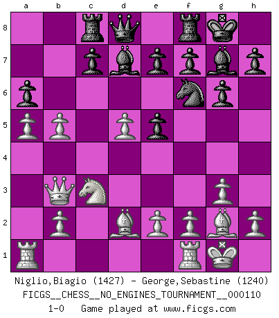 Last move : 1-0 2020 April 21 20:7:14 [Event "FICGS__CHESS__NO_ENGINES_TOURNAMENT__000110"] [Site "FICGS"] [Date "2020.01.13"] [Round "1"] [White "Niglio,Biagio"] [Black "George,Sebastine"] [Result "1-0"] [WhiteElo "1427"] [BlackElo "1240"] 1.d4 Nc6 2.Nf3 d6 3.c4 Nf6 4.d5 Ne5 5.Nxe5 dxe5 6.Nc3 g6 7.g3 Bg7 8.Bg2 O-O 9.O-O a6 10.Qc2 Rb8 11.a4 Bd7 12.Bd2 Rc8 13.Qb3 b6 14.a5 b5 15.cxb5 1-0 Queen's pawn : Lundin (Kevitz-Mikenas) defense Kingside Castling by player Black (move 8) Kingside Castling by player White (move 9) Player White won this chess game. Follow this game move after move (download)I like the moment when I break a man's ego. (Bobby Fischer) Im Internet Chess Club betrug mein Rating vorübergehend 3350 ELO-Punkte. (Sergej Karjakin) Cuando tengas duda... ¡juega al Ajedrez!. (Tevis) La vie est comme un jeu d'échecs : nous esquissons un plan, mais celui-ci est tributaire de ce que daignent faire l'adversaire aux échecs et le destin dans la vie. (Arthur Schopenhauer) Being number two sucks. (Andre Agassi)
