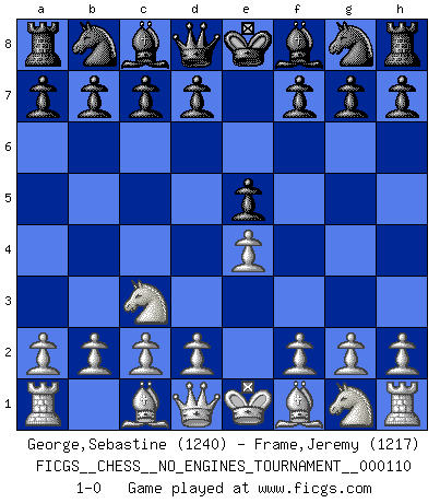 Last move : 1-0 2020 February 24 12:54:36 [Event "FICGS__CHESS__NO_ENGINES_TOURNAMENT__000110"] [Site "FICGS"] [Date "2020.01.13"] [Round "1"] [White "George,Sebastine"] [Black "Frame,Jeremy"] [Result "1-0"] [WhiteElo "1240"] [BlackElo "1217"] 1.Nc3 e5 2.e4 1-0 This chess game has been lost on time (started : 2020.01.13 21:37:32) Dunst (Sleipner-Heinrichsen) Opening Player White won this chess game. Follow this game move after move (download)All I want to do, ever, is just play Chess. (Bobby Fischer) Wenn Capablanka heute auf der Schachbühne erscheinen würde, hätte er ein halbes Jahr gebraucht um sich die Schachtheorie anzueignen. Und dann hätte er alles und jeden besiegt. (Mikhail Moiseyevich Botvinik) En el Ajedrez, cuando menos, el valiente hereda la tierra. (Edmar Mednis) Aidez vos pièces, elles vous aideront. (Paul Morphy) You must have a dream in order to have it come true. (A.P.J. Kalam)