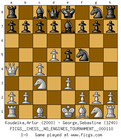 Last move : 1-0 2020 March 31 19:50:48 [Event "FICGS__CHESS__NO_ENGINES_TOURNAMENT__000110"] [Site "FICGS"] [Date "2020.01.13"] [Round "1"] [White "Koudelka,Artur"] [Black "George,Sebastine"] [Result "1-0"] [WhiteElo "2000"] [BlackElo "1240"] 1.c4 Nc6 2.d4 e5 3.d5 Nd4 4.e3 Nf5 5.Nc3 Be7 6.Qa4 1-0 This chess game has been lost on time (started : 2020.01.13 21:37:32) English Opening Player White won this chess game. Follow this game move after move (download)Many Chess players were surprised when after the game, Fischer quietly explained: 'I had already analyzed this possibility' in a position which I thought was not possible to foresee from the opening. (Mikhail Tal) Ein Isolani verdüstert die Stimmung auf dem ganzen Schachbrett. (Savielly Grigorievitsch Tartakower) El Ajedrez es 99 por ciento táctica. (Teichmann) Le jeu d'échecs est comme rejeté hors du temps. (Antoine de Saint-Exupéry) Better than a thousand days of diligent study is one day with a great teacher. (Japanese proverb)