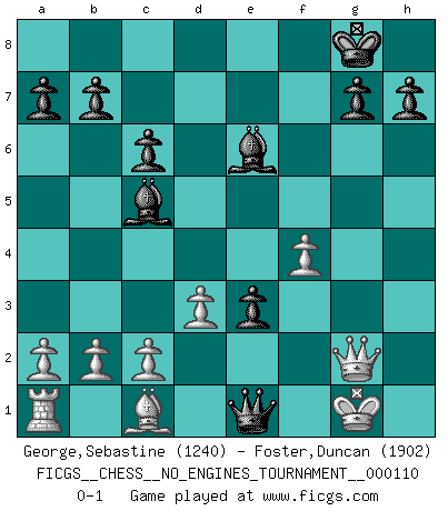 Last move : 0-1 2020 April 18 3:39:58 [Event "FICGS__CHESS__NO_ENGINES_TOURNAMENT__000110"] [Site "FICGS"] [Date "2020.01.13"] [Round "1"] [White "George,Sebastine"] [Black "Foster,Duncan"] [Result "0-1"] [WhiteElo "1240"] [BlackElo "1902"] 1.Nc3 d5 2.e4 d4 3.Nd5 c6 4.Nf4 e5 5.Nd3 Bd6 6.Be2 Nf6 7.Bf3 O-O 8.Ne2 Nxe4 9.Bxe4 f5 10.Bxf5 Bxf5 11.O-O e4 12.Ne1 Qh4 13.Ng3 Nd7 14.d3 Bg4 15.Qd2 e3 16.fxe3 Rxf1+ 17.Nxf1 Rf8 18.h3 Be6 19.Nf3 Rxf3 20.gxf3 Ne5 21.Qf2 Qh5 22.f4 Nf3+ 23.Kh1 dxe3 24.Qg3 Bxh3 25.Nh2 Nxh2 26.Kxh2 Be6 27.Kg1 Qd1+ 28.Kh2 Qe2+ 29.Kg1 Bc5 30.Qg2 Qe1+ 0-1 Dunst (Sleipner, Heinrichsen) Opening Kingside Castling by player Black (move 7) Kingside Castling by player White (move 11) Player Black won this chess game. Follow this game move after move (download)The enormous mental resilience, without which no Chess player can exist, was so much taken up by Chess that he could never free his mind of this game. (Albert Einstein) Bis zum Jahr 1971 verlief in meiner Schachkariere alles glatt. Dieses dramatische Match [Fischer-Taimanov 6:0] machte mein Leben zur Hölle. (Mark Taimanov) El Ajedrez es el gimnasio de la mente. (Blaise Pascal) Votre seul travail dans les ouvertures est d'obtenir un milieu de partie jouable. (Lajos Portish) Creativity involves breaking out of established patterns in order to look at things in a different way. (Edward De Bono)