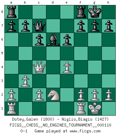 Last move : 0-1 2020 April 23 8:40:45 [Event "FICGS__CHESS__NO_ENGINES_TOURNAMENT__000110"] [Site "FICGS"] [Date "2020.01.13"] [Round "1"] [White "Dotey,Galen"] [Black "Niglio,Biagio"] [Result "0-1"] [WhiteElo "1800"] [BlackElo "1427"] 1.e4 c6 2.Nc3 d5 3.Nf3 Bg4 4.Be2 e6 5.O-O dxe4 6.Nxe4 Nd7 7.d3 Ngf6 8.Be3 Be7 9.Bd4 O-O 10.b3 Nxe4 11.dxe4 Nc5 12.Bxc5 Bxc5 13.Nd2 Bxe2 14.Qxe2 Qc7 15.Qc4 Bd6 0-1 Comment by player 1 : Galen Dotey : Good luck! Caro-Kann : Two knights, 3...Bg4 Kingside Castling by player White (move 5) Kingside Castling by player Black (move 9) Player Black won this chess game. Follow this game move after move (download)It's just you and your opponent at the board and you're trying to prove something. (Bobby Fischer) Ich war schon mal beim Dopingtest. Da musste ich Urin abgeben, während Dritte zusahen. (Elisabeth Pähtz) El Ajedrez es una guerra en un tablero. El objetivo es aplastar la mente del oponente. (Bobby Fischer) Il s'avisa de me proposer d'apprendre les échecs qu'il jouait un peu... me voilà forcené des échecs. J'achète un échiquier, je m'enferme dans ma chambre, j'y passe des jours et des nuits à vouloir apprendre par cur toutes les parties. (Jean-Jacques Rousseau, Confessions) SEO proverb : Make your website optimized for human beings, not for search engines.