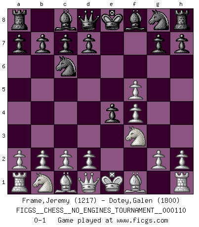 Last move : 0-1 2020 February 23 23:58:49 [Event "FICGS__CHESS__NO_ENGINES_TOURNAMENT__000110"] [Site "FICGS"] [Date "2020.01.13"] [Round "1"] [White "Frame,Jeremy"] [Black "Dotey,Galen"] [Result "0-1"] [WhiteElo "1217"] [BlackElo "1800"] 1.e4 e5 2.f4 Nc6 3.Nf3 f5 4.exf5 e4 0-1 This chess game has been lost on time (started : 2020.01.13 21:37:32) Comment by player 2 : Galen Dotey : Good luck! King's gambit Player Black won this chess game. Follow this game move after move (download)Avoid the crowd. Do your own thinking independently. Be the Chess player, not the Chess piece. (Ralph Charell) Wie ich sie so einen nach dem anderen nieder mähte wurde meine Überlegenheit offensichtlich. (José Raúl Capablanca) El Ajedrez es la vida. (Bobby Fischer) Les écrivains ont utilisé les échecs pour analyser les côtés extrêmes de la nature humaine. Dans ce cadre, les échecs offrent un champ d'expérimentation idéal. Mais on pourrait faire la même chose avec la peinture. Et là, en vous référant à Van Gogh, vous ne tirerez pas de conclusion définitive sur les peintres. (Gary Kasparov) The leaves of memory seemed to make a mournful rustling in the dark. (Henry Wadsworth Longfellow)