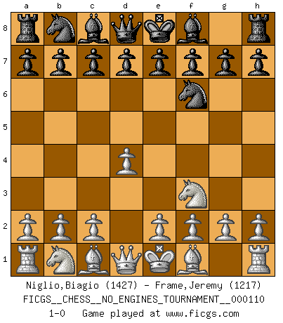 Last move : 1-0 2020 February 24 12:54:36 [Event "FICGS__CHESS__NO_ENGINES_TOURNAMENT__000110"] [Site "FICGS"] [Date "2020.01.13"] [Round "1"] [White "Niglio,Biagio"] [Black "Frame,Jeremy"] [Result "1-0"] [WhiteElo "1427"] [BlackElo "1217"] 1.d4 Nf6 2.Nf3 1-0 This chess game has been lost on time (started : 2020.01.13 21:37:32) Queen's pawn game Player White won this chess game. Follow this game move after move (download)If Chess is a science, it's a most inexact one. If Chess is an art, it is too exacting to be seen as one. If Chess is a sport, it's too esoteric. If Chess is a game, it's too demanding to be just a game. If Chess is a mistress, she's a demanding one. If Chess is a passion, it's a rewarding one. If Chess is life, it's a sad one. (Unknown) Wer wird heute Abend ihr Gegner sein? -- Heute Abend spiele ich gegen die schwarzen Steine. (Akiba Rubinstein) Solo puedes ser bueno en el Ajedrez si amas al juego. (Bobby Fischer) Il n'y a pas de prix trop élevé au scalp de l'ennemi. (Koblentz) Creativity is allowing yourself to make mistakes. Art is knowing which ones to keep. (Scott Adams)