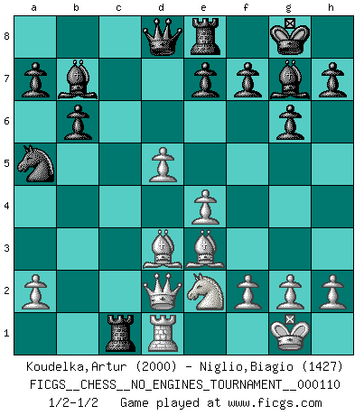 Last move : 1/2-1/2 2020 July 24 9:50:32 [Event "FICGS__CHESS__NO_ENGINES_TOURNAMENT__000110"] [Site "FICGS"] [Date "2020.01.13"] [Round "1"] [White "Koudelka,Artur"] [Black "Niglio,Biagio"] [Result "1/2-1/2"] [WhiteElo "2000"] [BlackElo "1427"] 1.d4 Nf6 2.c4 g6 3.Nc3 d5 4.cxd5 Nxd5 5.e4 Nxc3 6.bxc3 Bg7 7.Bc4 c5 8.Ne2 Nc6 9.Be3 O-O 10.O-O Na5 11.Bd3 b6 12.Qd2 Re8 13.Rfd1 Bb7 14.Rac1 cxd4 15.cxd4 Rc8 16.d5 Rxc1 1/2-1/2 King's Indian defense, 3.Nc3 Kingside Castling by player Black (move 9) Kingside Castling by player White (move 10) This chess game ended in a draw. Follow this game move after move (download)The King is a fighting piece. Use it ! (Wilhelm Steinitz) Es ist besser die Steine des Gegners zu opfern. (Savielly Grigorievitsch Tartakower) El Ajedrez es un expediente tonto que hace creer a la gente inactiva que hacen una cosa muy astuta cuando solamente estan perdiendo su tiempo. (George Bernard Shaw) Ce qui caractérise les parties de combat, c'est que si le défenseur a constamment de difficiles problèmes à résoudre, l'attaquant doit chercher sans relâche de nouvelles possibilités d'attaque. (Koblentz) Gambling : The sure way of getting nothing from something. (Wilson Mizner)