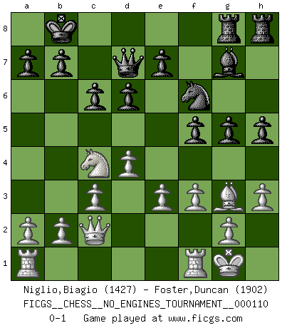 Last move : 0-1 2020 March 11 16:41:41 [Event "FICGS__CHESS__NO_ENGINES_TOURNAMENT__000110"] [Site "FICGS"] [Date "2020.01.13"] [Round "1"] [White "Niglio,Biagio"] [Black "Foster,Duncan"] [Result "0-1"] [WhiteElo "1427"] [BlackElo "1902"] 1.d4 f5 2.Nf3 Nf6 3.Bf4 d6 4.e3 h6 5.h3 g5 6.Bh2 Bg7 7.Be2 c6 8.Nbd2 Qb6 9.Nc4 Qc7 10.c3 Be6 11.Ncd2 Nbd7 12.Bc4 Bxc4 13.Nxc4 O-O-O 14.Qc2 Ne4 15.O-O Ndf6 16.Nfd2 Qd7 17.Nxe4 Nxe4 18.f3 Nf6 19.Bg3 h5 20.Qa4 Kb8 21.Qc2 Rdg8 0-1 Dutch Queenside Castling by player Black (move 13) Kingside Castling by player White (move 15) Player Black won this chess game. Follow this game move after move (download)The enormous mental resilience, without which no Chess player can exist, was so much taken up by Chess that he could never free his mind of this game. (Albert Einstein) Man kann eine Schachpartie nur gewinnen, wenn das Gleichgewicht gestört ist. In einer Stellung mit ungestörtem Gleichgewicht ist auch das größte Genie hilflos - in der Stellung steckt dann eben kein genialer Einfall. (Wilhelm Steinitz) Yo siempre he tenido un ligero sentimiento de lástima por una persona que no tiene conocimiento del Ajedrez. (Siegbert Tarrasch) Les Cavaliers se révèlent fort utiles dans les positions fermées. D'habitude, les Fous sont un peu plus forts que les Cavaliers dans les positions ouvertes. Qu'on le veuille ou non, il restera toujours des exceptions ! The only thing that overcomes hard luck is hard work. (Harry Golden)
