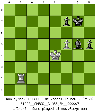 Last move : 1/2-1/2 2008 January 10 3:57:35 [Event "FICGS__CHESS__CLASS_SM__000007"] [Site "FICGS"] [Date "2007.07.05"] [Round "1"] [White "Noble,Mark"] [Black "de Vassal,Thibault"] [Result "1/2-1/2"] [WhiteElo "2471"] [BlackElo "2463"] 1.e4 c5 2.Nf3 d6 3.d4 cxd4 4.Nxd4 Nf6 5.Nc3 a6 6.Be3 e5 7.Nb3 Be6 8.f3 Be7 9.Qd2 O-O 10.O-O-O Nbd7 11.g4 b5 12.g5 b4 13.Ne2 Ne8 14.f4 a5 15.f5 a4 16.Nbd4 exd4 17.Nxd4 b3 18.Kb1 bxc2+ 19.Nxc2 Bb3 20.axb3 axb3 21.Na3 Ne5 22.h4 Ra4 23.Bd4 Qa8 24.Qe3 Kh8 25.Bb5 Ra5 26.Bc3 Ra7 27.h5 Nc7 28.Bd3 Rxa3 29.bxa3 Qxa3 30.Rd2 Rc8 31.h6 gxh6 32.Rxh6 Ne6 33.g6 Ng5 34.Ba6 Rxc3 35.Qxc3 Qxa6 36.Qxe5+ dxe5 37.g7+ Kxg7 38.Rxa6 Nxe4 39.Rg2+ Bg5 40.Rg4 Nd2+ 41.Kb2 h6 42.Kc3 Nf3 43.Kd3 b2 44.Rb6 e4+ 45.Rxe4 Nd2 46.Rxb2 Nxe4 47.Kxe4 h5 1/2-1/2 Comment by player 2 : Thibault de Vassal : Hello Mark. Thanks for an interesting game ! This opening is really hard for Black :) Best wishes, Thibault Sicilian : Najdorf, Byrne (English) attack Kingside Castling by player Black (move 9) Queenside Castling by player White (move 10) 10 pieces endgame at move 45 : White KRRP , Black KBNPPP WHITE : King + 2 Rooks 1 Pawn BLACK : King + 1 Bishop 1 Knight 3 Pawns 9 pieces endgame at move 46 : White KRRP , Black KBNPP WHITE : King + 2 Rooks 1 Pawn BLACK : King + 1 Bishop 1 Knight 2 Pawns 8 pieces endgame at move 46 : White KRP , Black KBNPP WHITE : King + 1 Rook 1 Pawn BLACK : King + 1 Bishop 1 Knight 2 Pawns 7 pieces endgame at move 47 : White KRP , Black KBPP WHITE : King + 1 Rook 1 Pawn BLACK : King + 1 Bishop 2 Pawns This chess game ended in a draw. Follow this game move after move (download)You can only get good at Chess if you love the game. (Bobby Fischer) Die Leute spielen gegen mich seit 15 Jahren unter Ihren Möglichkeiten. (Robert James Fischer) Fischer es el jugador mas fuerte del mundo. De hecho, el jugador mas fuerte que jamas haya existido. (Larry Evans) Echiquier : carré parfait, comme la Jérusalem nouvelle décrite par l'auteur de l'Apocalypse, huit cases sur huit, exaltation du chiffre 4, symbole du cosmos aux quatre horizons... où le noir et le blanc, l'ombre et la lumière, le mal et le bien s'entremêlent et se conjuguent. (Robert Couffignal, Le Gambit du poète) History is the quarrels of popes and kings, with wars or pestilences in every page; the men all so good for nothing, and hardly any women at all. (Jane Austen)