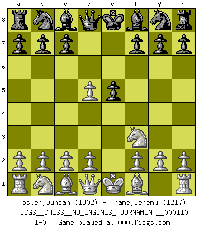 Last move : 1-0 2020 February 24 12:54:36 [Event "FICGS__CHESS__NO_ENGINES_TOURNAMENT__000110"] [Site "FICGS"] [Date "2020.01.13"] [Round "1"] [White "Foster,Duncan"] [Black "Frame,Jeremy"] [Result "1-0"] [WhiteElo "1902"] [BlackElo "1217"] 1.e4 e5 2.Nf3 d5 3.exd5 1-0 This chess game has been lost on time (started : 2020.01.13 21:37:32) QP counter-gambit (elephant gambit) Player White won this chess game. Follow this game move after move (download)Any material change in a position must come about by mate, a capture, or a Pawn promotion. (Purdy) Die jungen Leute sollen verstehen, dass sie noch etwas von mir lernen können und müssen. (Viktor Kortschnoi) Aún deseo matar a Fischer. (Boris Spassky) Il vaut toujours mieux jouer un plan faux de façon logique que de n'avoir pas de plan du tout. (Victor Kortchnoï) All maxims have their antagonist maxims; proverbs should be sold in pairs, a single one being but a half truth. (William Mathews)