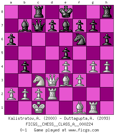 Last move : 0-1 2020 July 6 17:37:44 [Event "FICGS__CHESS__CLASS_A__000224"] [Site "FICGS"] [Date "2020.01.14"] [Round "1"] [White "Kalistratov,Aleksandr"] [Black "Duttagupta,Aniruddha"] [Result "0-1"] [WhiteElo "2000"] [BlackElo "2093"] 1.e4 c5 2.Nf3 e6 3.d4 cxd4 4.Nxd4 Nc6 5.Nc3 Qc7 6.Be3 a6 7.Qd2 Nf6 8.O-O-O Be7 9.f3 b5 10.g4 Nxd4 11.Qxd4 Bb7 12.h4 Rc8 13.Rd2 h6 14.Rg1 e5 15.Qd3 b4 0-1 This chess game has been lost on time (started : 2020.01.14 14:39:22) Sicilian : Taimanov variation Queenside Castling by player White (move 8) Player Black won this chess game. Follow this game move after move (download)A win by an unsound combination, however showy, fills me with artistic horror. (Wilhelm Steinitz) Ich trinke, ich rauche, ich spiele, ich liebe Frauen aber Fernschach ist ein Laster, das ich nicht habe. (Mikhail Nekhemyevich Tal) Cuando tengas duda... ¡juega al Ajedrez!. (Tevis) En blitz, le Cavalier l'emporte sur le Fou. (Vlastimil Hort) To steal ideas from one person is plagiarism. To steal from many is research. (Unknown)