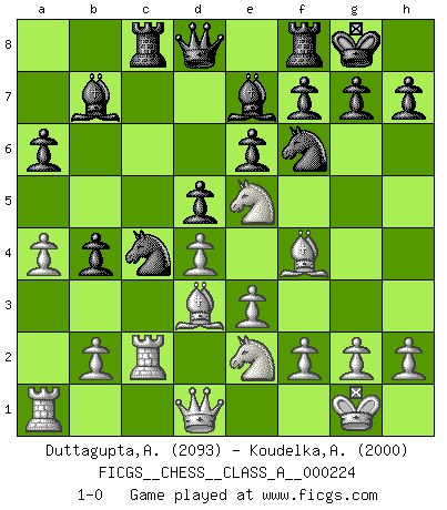 Last move : 1-0 2020 July 15 16:47:53 [Event "FICGS__CHESS__CLASS_A__000224"] [Site "FICGS"] [Date "2020.01.14"] [Round "1"] [White "Duttagupta,Aniruddha"] [Black "Koudelka,Artur"] [Result "1-0"] [WhiteElo "2093"] [BlackElo "2000"] 1.d4 d5 2.c4 c6 3.cxd5 cxd5 4.Bf4 Nc6 5.e3 Nf6 6.Nc3 Bf5 7.Qb3 Na5 8.Qa4+ Bd7 9.Qc2 Rc8 10.Nf3 e6 11.Bd3 b5 12.a3 Be7 13.O-O O-O 14.Ne5 a6 15.Rfc1 Bc6 16.a4 b4 17.Ne2 Bb7 18.Qd1 Nc4 19.Rc2 1-0 This chess game has been lost on time (started : 2020.01.14 14:39:22) QGD Slav defense : Exchange variation Kingside Castling by player White (move 13) Kingside Castling by player Black (move 13) Player White won this chess game. Follow this game move after move (download)You sit at the board and suddenly your heart leaps. Your hand trembles to pick up the piece and move it. But what Chess teaches you is that you must sit there calmly and think about whether it's really a good idea and whether there are other better ideas. (Stanley Kubrick) Schach ist Krieg, im Schach geht es um testosterongesteuerte Urschreie. (Garry Kasparov) El Ajedrez es sobre todo, ¡una pelea!. (Emanuel Lasker) Soyez une menace à chaque fois que vous vous asseyez pour jouer. (Ken Smith) Chess, like love, like music, has the power to make people happy. (Siegbert Tarrasch)