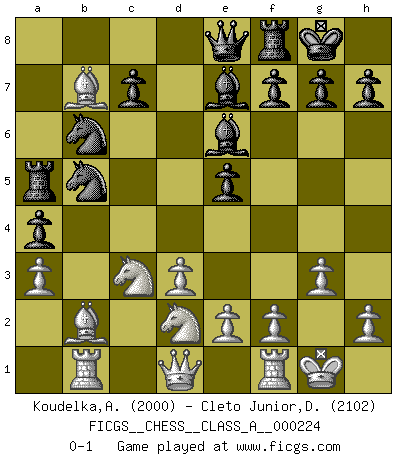 Last move : 0-1 2020 May 21 22:45:10 [Event "FICGS__CHESS__CLASS_A__000224"] [Site "FICGS"] [Date "2020.01.14"] [Round "1"] [White "Koudelka,Artur"] [Black "Cleto Junior,Dirceu"] [Result "0-1"] [WhiteElo "2000"] [BlackElo "2102"] 1.c4 e5 2.Nc3 Nf6 3.Nf3 Nc6 4.g3 d5 5.cxd5 Nxd5 6.Bg2 Nb6 7.O-O Be7 8.a3 O-O 9.d3 Be6 10.b4 a5 11.b5 Nd4 12.Nd2 a4 13.Bxb7 Ra5 14.Rb1 Qe8 15.Bb2 Nxb5 0-1 This chess game has been lost on time (started : 2020.01.14 14:39:22) English Opening Kingside Castling by player White (move 7) Kingside Castling by player Black (move 8) Player Black won this chess game. Follow this game move after move (download)Why must I lose to this idiot ? (Aron Nimzovich) Mutter, ich bin eben Ex-Weltmeister geworden. --beim nach Hause Kommen nach dem Verlust des WM-Titels an Mihail Botvinnik -- (Mikhail Nekhemyevich Tal) Es el objetivo de la escuela moderna no tratar cada posición de acuerdo a una regla general, sino de acuerdo al principio inherente en la posición. (Richard Reti) Un footballeur joue avec ses pieds, parfois avec sa tête. Un joueur d'échecs ne joue qu'avec sa tête. Et quand il ne joue plus, il meurt. (Jacob Murray) First of all, we have to go back to the classical time control. (Anatoly Karpov)