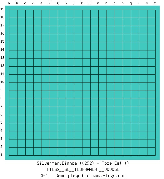 Last move : 0-1 2020 February 15 7:24:14 [Event "FICGS__GO__TOURNAMENT__000058"] [Site "FICGS"] [Date "2020.01.15"] [Round "1"] [Black "Silverman,Bianca"] [White "Toze,Est"] [Result "0-1"] [Rating 1 "0292"] 0-1 This go game has been lost on time (started : 2020.01.15 21:13:11) Here are the names of the openings (joseki) played in the four corners : Player White won this Go (weiqi, baduk) game. Follow this game move after move (download)If there is no stone on the handicap point, the carpenter's square is dead. (Anonymous) A specialist learns more and more about less and less until he knows everything about nothing. (Nicholas Murray Butler)