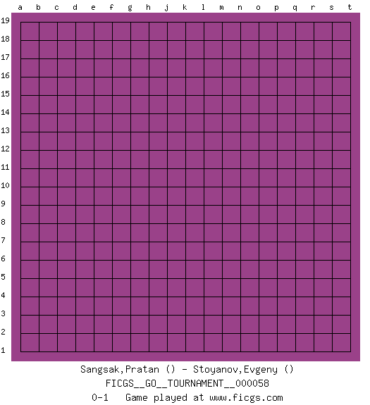 Last move : 0-1 2020 February 15 7:24:14 [Event "FICGS__GO__TOURNAMENT__000058"] [Site "FICGS"] [Date "2020.01.15"] [Round "1"] [Black "Sangsak,Pratan"] [White "Stoyanov,Evgeny"] [Result "0-1"] 0-1 This go game has been lost on time (started : 2020.01.15 21:13:11) Here are the names of the openings (joseki) played in the four corners : Player White won this Go (weiqi, baduk) game. Follow this game move after move (download)With less than 15 stones in danger, tenuki. (Anonymous) I live to kill Traxler counterattack. (Ilmars Cirulis)