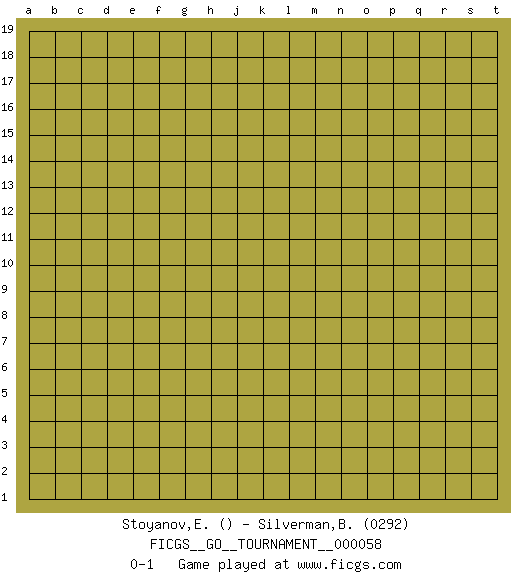 Last move : 0-1 2020 February 15 7:24:14 [Event "FICGS__GO__TOURNAMENT__000058"] [Site "FICGS"] [Date "2020.01.15"] [Round "1"] [Black "Stoyanov,Evgeny"] [White "Silverman,Bianca"] [Result "0-1"] [Rating 2 "0292"] 0-1 This go game has been lost on time (started : 2020.01.15 21:13:11) Here are the names of the openings (joseki) played in the four corners : Player White won this Go (weiqi, baduk) game. Follow this game move after move (download)Don't reduce your own liberties. (Bill Taylor) To err is human, but to really foul things up requires a computer. (Farmer's Almanac, 1978)