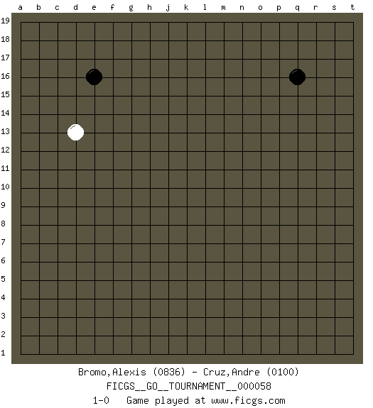 Last move : 1-0 2020 February 16 10:52:2 [Event "FICGS__GO__TOURNAMENT__000058"] [Site "FICGS"] [Date "2020.01.15"] [Round "1"] [Black "Bromo,Alexis"] [White "Cruz,Andre"] [Result "1-0"] [Rating 1 "0836"] [Rating 2 "0100"] 1.e16 d13 2.q16 1-0 This go game has been lost on time (started : 2020.01.15 21:13:11) Here are the names of the openings (joseki) played in the four corners : Corner d16 : e16 d13 Takamoku (Gomok, Gaomu`) 5-4 Point. The takamoku (high) point (5-4). With its emphasis on influence, the 5-4 point complements the 4-4 (hoshi) point in creating an influence-oriented fuseki. Player Black won this Go (weiqi, baduk) game. Follow this game move after move (download)Knight's moves win running battles. (Anonymous) Pushing plastic is for the many, pushing virtual pieces is for the fewer, pushing wood is for the very few. (Normajean Yates)