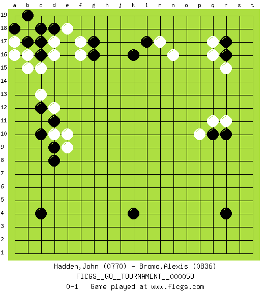 Last move : 0-1 2020 April 13 12:18:49 [Event "FICGS__GO__TOURNAMENT__000058"] [Site "FICGS"] [Date "2020.01.15"] [Round "1"] [Black "Hadden,John"] [White "Bromo,Alexis"] [Result "0-1"] [Rating 1 "0770"] [Rating 2 "0836"] 1.c4 q16 2.r4 d16 3.r16 r15 4.r17 q17 5.k4 d10 6.c10 p10 7.q10 q11 8.r10 r11 9.k16 m17 10.l17 n16 11.g16 f17 12.g17 f16 13.c16 c15 14.c17 d17 15.d18 e18 16.c18 b16 17.b17 b15 18.b19 a17 19.a18 a16 20.c12 d12 21.d8 e9 22.d9 c13 23.d11 e10 0-1 This go game has been lost on time (started : 2020.01.15 21:13:11) Here are the names of the openings (joseki) played in the four corners : Corner q16 : q16 r16 Hoshi (Hwajeom, Seongjeom, Xingwei`) 4-4 Point. The star or hoshi (4-4) point, emphasizing influence at the potential expense of territory. Corner d16 : d16 g16 Hoshi (Hwajeom, Seongjeom, Xingwei`) 4-4 Point. The star or hoshi (4-4) point, emphasizing influence at the potential expense of territory. Niken Takagakari (Dukan Nop'dakeolch'im, E`r Gaojia, 2-Space High Approach). Black 2 is a light approach move. Rarely played in even games, Black 2 is typically employed in handicap games. White continues with 6-4 or 3-10. In Korean Sunjang Baduk White has a stone on 8-4. Player White won this Go (weiqi, baduk) game. Follow this game move after move (download)There is death in the hane. (Anonymous) Wisdom doesn't necessarily come with age. Sometimes age just shows up all by itself. (Tom Watson)