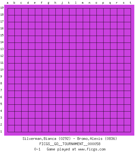 Last move : 0-1 2020 February 15 7:24:14 [Event "FICGS__GO__TOURNAMENT__000058"] [Site "FICGS"] [Date "2020.01.15"] [Round "1"] [Black "Silverman,Bianca"] [White "Bromo,Alexis"] [Result "0-1"] [Rating 1 "0292"] [Rating 2 "0836"] 0-1 This go game has been lost on time (started : 2020.01.15 21:13:11) Here are the names of the openings (joseki) played in the four corners : Player White won this Go (weiqi, baduk) game. Follow this game move after move (download)Five groups might live but the six will die. (Anonymous) Once you start thinking you have nothing left to learn, you have everything to learn. (Steve Badget)