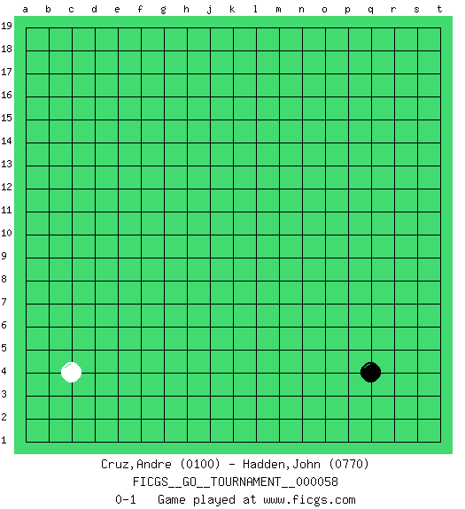 Last move : 0-1 2020 February 20 12:11:15 [Event "FICGS__GO__TOURNAMENT__000058"] [Site "FICGS"] [Date "2020.01.15"] [Round "1"] [Black "Cruz,Andre"] [White "Hadden,John"] [Result "0-1"] [Rating 1 "0100"] [Rating 2 "0770"] 1.q4 c4 0-1 This go game has been lost on time (started : 2020.01.15 21:13:11) Here are the names of the openings (joseki) played in the four corners : Corner d4 : c4 0-1 Komoku (Somok, Xiao~mu`) 3-4 Point. The komoku (3-4) point is the traditional corner enclosure move.. Player White won this Go (weiqi, baduk) game. Follow this game move after move (download)Capture what you cut off. (Anonymous) Train yourself to let go of everything you fear to lose. (Master Yoda in Star Wars ep.3)