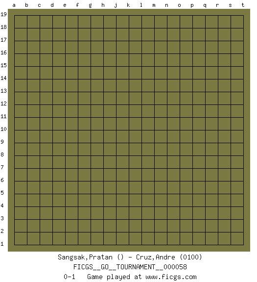 Last move : 0-1 2020 February 15 7:24:14 [Event "FICGS__GO__TOURNAMENT__000058"] [Site "FICGS"] [Date "2020.01.15"] [Round "1"] [Black "Sangsak,Pratan"] [White "Cruz,Andre"] [Result "0-1"] [Rating 2 "0100"] 0-1 This go game has been lost on time (started : 2020.01.15 21:13:11) Here are the names of the openings (joseki) played in the four corners : Player White won this Go (weiqi, baduk) game. Follow this game move after move (download)Conservative and slow will win. Believe it ! (Anonymous) If you don't practice you don't deserve to win. (Andre Agassi)