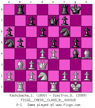 Last move : 0-1 2020 June 19 0:48:22 [Event "FICGS__CHESS__CLASS_B__000318"] [Site "FICGS"] [Date "2020.01.16"] [Round "1"] [White "Kachibacha,Jobadi"] [Black "Dimitrov,George"] [Result "0-1"] [WhiteElo "1800"] [BlackElo "2089"] 1.e4 e5 2.Nf3 Nf6 3.Nc3 Nc6 4.Bb5 Bb4 5.O-O O-O 6.d3 d6 7.Bg5 Bxc3 8.bxc3 Bd7 9.Rb1 h6 10.Bh4 a6 11.Ba4 b5 12.Bb3 Qe7 13.Re1 Na5 14.d4 Bg4 15.Qd3 Rab8 16.Nd2 g5 0-1 This chess game has been lost on time (started : 2020.01.16 8:37:4) Petrov Three knights game Kingside Castling by player White (move 5) Kingside Castling by player Black (move 5) Player Black won this chess game. Follow this game move after move (download)Human affairs are like a Chess game: only those who do not take it seriously can be called good players. (Hung Tzu Ch'eng) Matt entspricht nicht immer den Tatsachen. (Savielly Grigorievitsch Tartakower) Las piezas de Ajedrez son los bloques del alfabeto que moldean los pensamientos; y esos pensamientos, aunque hagan un diseño visual en el tablero, expresan abstractamente su belleza como un poema. (Marcel Duchamp) Dieu déplace le joueur, et celui-ci la pièce. Quel Dieu derrière Dieu commence donc la trame ? Arturo Perez-Reverte (prix de littérature policière 1993). The best weapon against an enemy is another enemy. (Friedrich Nietzsche)