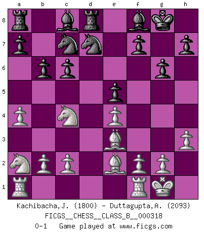 Last move : 0-1 2020 July 2 13:14:27 [Event "FICGS__CHESS__CLASS_B__000318"] [Site "FICGS"] [Date "2020.01.16"] [Round "1"] [White "Kachibacha,Jobadi"] [Black "Duttagupta,Aniruddha"] [Result "0-1"] [WhiteElo "1800"] [BlackElo "2093"] 1.e4 d6 2.d4 Nf6 3.Nc3 g6 4.Nf3 Bg7 5.Be2 O-O 6.O-O c6 7.a4 Qc7 8.h3 Nbd7 9.Be3 b6 10.Nd2 e5 11.dxe5 dxe5 12.Nc4 Rd8 13.Qd6 Ne8 14.Qxc7 Nxc7 15.Na2 Bf8 0-1 This chess game has been lost on time (started : 2020.01.16 8:37:4) Pirc : Classical system, 5.Be2 Kingside Castling by player Black (move 5) Kingside Castling by player White (move 6) Player Black won this chess game. Follow this game move after move (download)It's just you and your opponent at the board and you're trying to prove something. (Bobby Fischer) Wer sich die Fähigkeit anerziehen will im Schach selbstständig zu denken, der muß alles meiden, was leblos ist: ausgeklügelte Theorien, die sich auf sehr wenige Beispiele und eine Menge Hirngespinste stützen. (Emanuel Lasker) Cuando no sepas que mover, espera por una idea que se le venga a la la cabeza de tu oponente. Tenlo por seguro de que esa idea estará incorrecta. (Siegbert Tarrasch) Des idées, des idées, j'en ai cent, j'en ai mille. Des bonnes, des mauvaises, applicables, irréalisables... Il suffit de faire le tri ! (Roos) If you lose the game you should win the analysis! (Proverb)