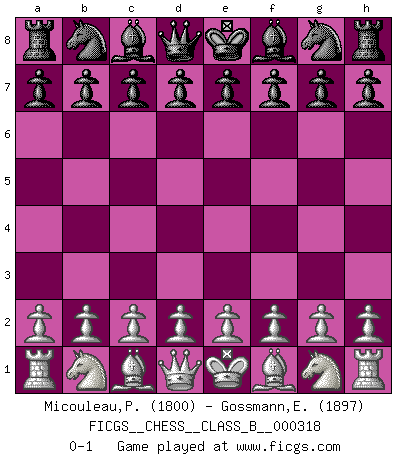 Last move : 0-1 2020 February 25 16:58:45 [Event "FICGS__CHESS__CLASS_B__000318"] [Site "FICGS"] [Date "2020.01.16"] [Round "1"] [White "Micouleau,Patrick"] [Black "Gossmann,Ewald"] [Result "0-1"] [WhiteElo "1800"] [BlackElo "1897"] 0-1 This chess game has been lost on time (started : 2020.01.16 8:37:4) Player Black won this chess game. Follow this game move after move (download)The battle for the ultimate truth will never be won. And that's why Chess is so fascinating. (Hans Kmoch) Um dein Spiel zu verbessern musst du zuallererst das Endspiel studieren, denn diese kann unabhängig studiert werden. Die Eröffnung und das Mittelspiel müssen immer in Bezug gesetzt werden zum Endspiel. (José Raúl Capablanca) El Ajedrez es imaginación. (David Bronstein) Si rien de grave n'est détecté lors de l'analyse d'une position, on joue alors le coup. Seconde règle de Blumenfeld. Convictions are more dangerous enemies of truth than lies. (Friedrich Nietzsche)