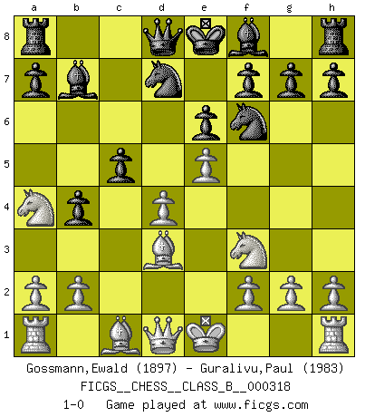 Last move : 1-0 2020 April 5 14:13:37 [Event "FICGS__CHESS__CLASS_B__000318"] [Site "FICGS"] [Date "2020.01.16"] [Round "1"] [White "Gossmann,Ewald"] [Black "Guralivu,Paul"] [Result "1-0"] [WhiteElo "1897"] [BlackElo "1983"] 1.d4 d5 2.c4 e6 3.Nc3 c6 4.e3 Nf6 5.Nf3 Nbd7 6.Bd3 dxc4 7.Bxc4 b5 8.Bd3 Bb7 9.e4 b4 10.Na4 c5 11.e5 1-0 QGD : Semi-Slav Player White won this chess game. Follow this game move after move (download)If you aren't afraid of Spassky, then I have removed the element of money. (Jim Slater) Schach verlangt totale Konzentration. (Robert James Fischer) En el Ajedrez, tal como es jugado por los Maestros, practicamente la suerte es eliminada. (Emanuel Lasker) Je menace de comprendre la position. (Anonyme) I can't decide which is riskier; taking crazy risks, or taking advice on crazy risks from a crazy risk taker. (Gregory House in House M.D.)